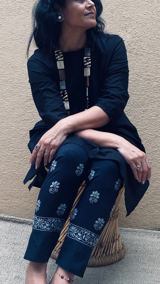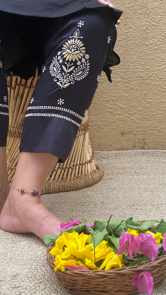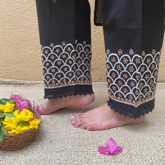 Black cotton straight pants with beige and white flower motif in Chikankari hand embroidery