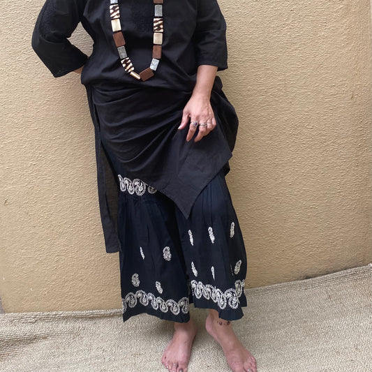 Black cotton pants with fish scale and flower design in Beige and White Chikankari